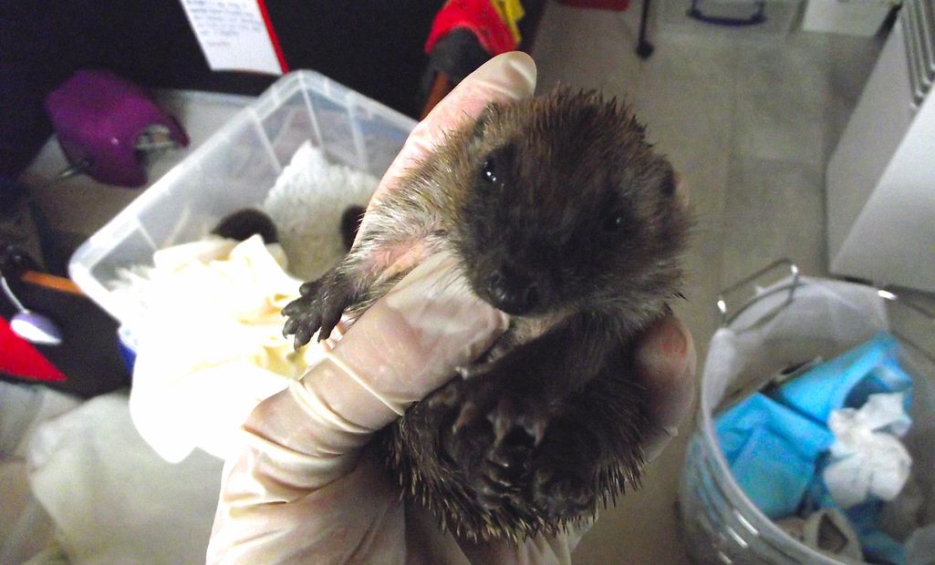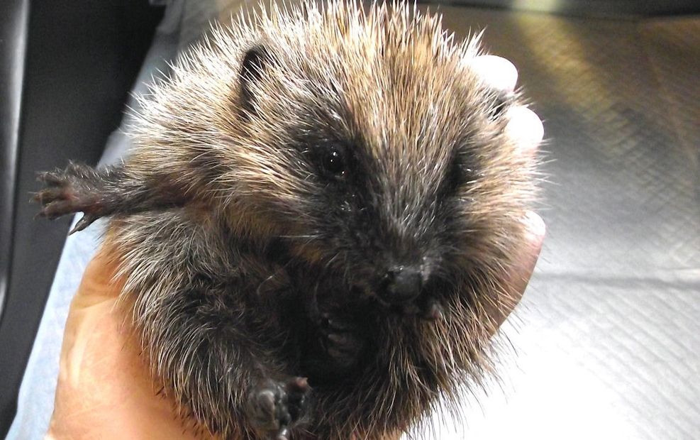This baby's finder had read that staggering is a sign of dehydration, so when she found this tiny hoglet out in the day, looking tipsy, she gave him water with a syringe. Some of the water went down into his lungs. Fortunately she realised her mistake quickly and he was rushed here. Otis had a very long hard and, at times, painful struggle, but he survived.
