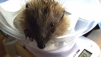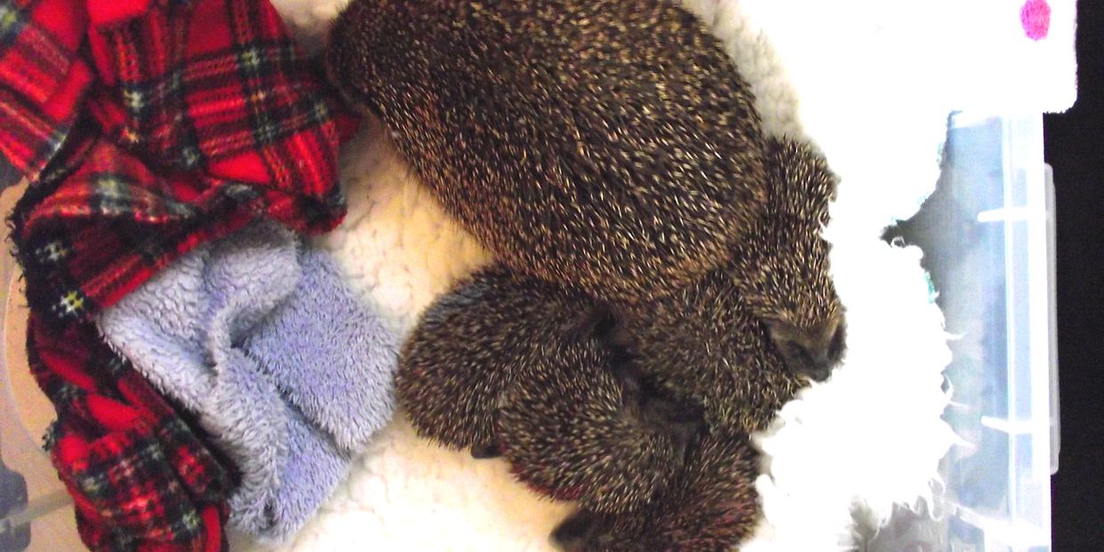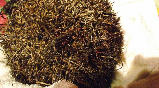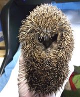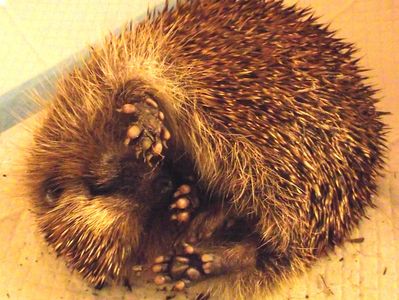 So please, never give food to a hedgehog casualty found out in the daytime until you've spoken to an experienced rescue. And never try to offer water directly into the casualty’s mouth. There is a real danger it will end up in the animal’s lungs, not their stomach, and she will die. Bring her indoors away from flies, put her in a high sided box or container (even sick hogs can climb), put a tee-shirt or tea-towel or some kitchen roll in with her so she can hide, provide a dish of some lukewarm water (body temperature water will be absorbed faster than cold), then leave her in peace in a quiet room, so she can feel safe enough to drink for herself while you phone a rescue.