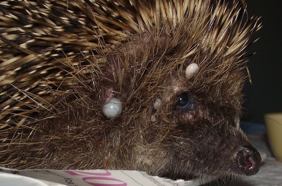 Flies will lay their eggs on anything that is still and will provide food for their offspring, including a sick hedgehog. Bobbin had been bitten by a dog and the blood had attracted flies. Fly eggs look like tiny rice grains and are clumped together. A fly blown hog is an emergency as within just a few hours the eggs will hatch into maggots, and begin to eat the hedgehog alive. Luckily Bobbin was brought in before the eggs had hatched.
